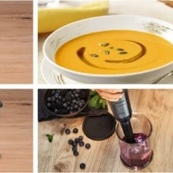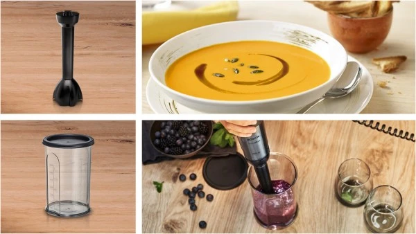 - Hochwertiger Edelstahl-Mixfuß: Verlässlich deutsche Bosch Qualität: robust und langlebig, geschmacksneutral, verfärbt nicht. Ideal für die Zubereitung von Karotten-/ oder Tomatensuppe.