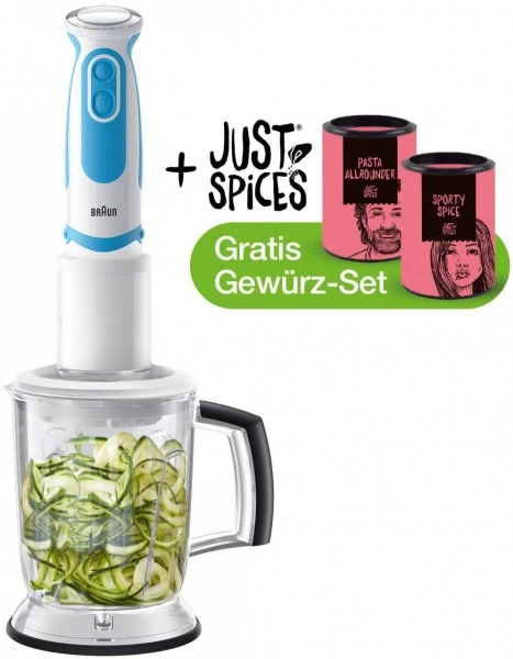 Der Braun Stabmixer MultiQuick 5 Vario Fit MQ 5060 Twist ist ein praktisches All-in-One Gerät für die Zubereitung von gesunden Mahlzeiten. Mit dem Gerät mixen Sie hausgemachte Suppen oder Saucen oder bereiten sich einen leckeren Smoothie zu. Dank SplashControl Technologie arbeiten Sie mit dem Braun Stabmixer nahezu ohne Spritzer. Der leistungsstarke 750 Watt Motor sowie 21 verschiedene Geschwindigkeitsstufen pürieren beinahe jedes Lebensmittel. Dank der zusätzlichen Extra Mahlklinge müssen Sie weniger Vorschneiden, sondern kriegen auch ganze Früchte oder Gemüse klein. Mit dem Spiralisierer Aufsatz und seinen drei verschieden großen Klingeneinsätzen (für Linguine, Tagliatelle und Pappardelle), lassen sich harte und weiche Gemüsesorten schnell spiralisieren, beispielsweise für Gemüsenudeln.