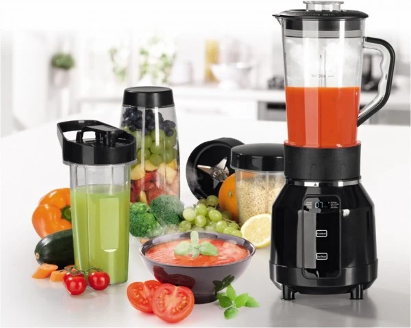Smoothies und Suppen aus frischem Obst und Gemüse liegen voll im Trend – und sind im „GOURMETmaxx“ Nutrition Mixer Pro ebenso blitzschnell zubereitet wie Cocktails, Milchshakes, Desserts, Soßen, Dips oder Pürees. Mit seinem 1200 Watt starken Motor hackt, zerkleinert, püriert, mahlt, mixt und mischt er nahezu alles, was ihm an die superscharfen Kreuzklingen kommt. Die clevere Heizfunktion ermöglicht zudem das schonende Erhitzen von Gemüse ohne Kochen – ideal für leckere Gemüse-Suppen. Die Benutzung des „GOURMETmaxx“ Nutrition Mixers Pro ist dank des digitalen Bedienfelds mit 2 Geschwindigkeitsstufen (schnell und langsam) und 6 voreingestellten Programmen für Hacken, Mahlen, Erhitzen, Eischrushen, Pürieren und Smoothies äußerst komfortabel. Auch die Reinigung ist ein Klacks: nahezu alle Zubehörteile des 12-teiligen Sets sind spülmaschinengeeignet (außer Klingen, Eisbehälter und Motoreinheit).