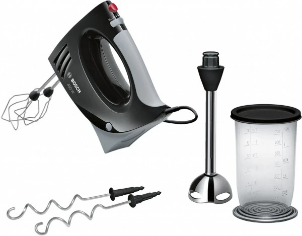 Beim Zubehör weiß das Bosch Handrührgerät MFQ35SL ebenfalls zu gefallen, denn hier erhalten Sie weitere praktische Helfer, die sich beim Backen und Kochen als nützlich erweisen. Das mitgelieferte Zubehör umfasst einen robusten lebensmittelechten Edelstahlmixfuß und einen Mixbecher mit Deckel zum Zerkleinern und Pürieren.